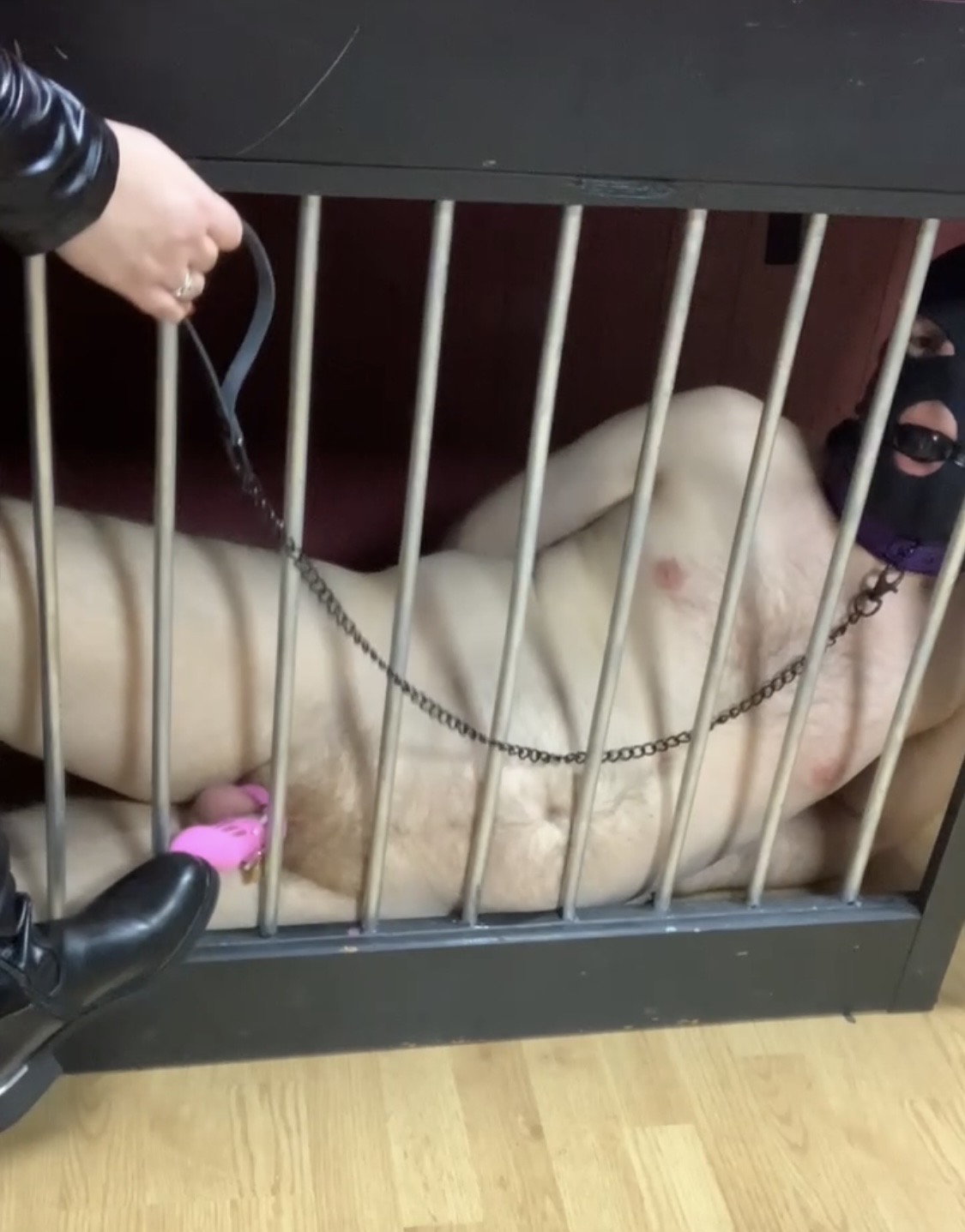 Il va subir la frustration sans aucune autorisation de se toucher, d’abord enfermé en cage, puis, accroché à La Croix, et ensuite emprisonné dans le carcan! Le tout ballonné, encagé et attaché…