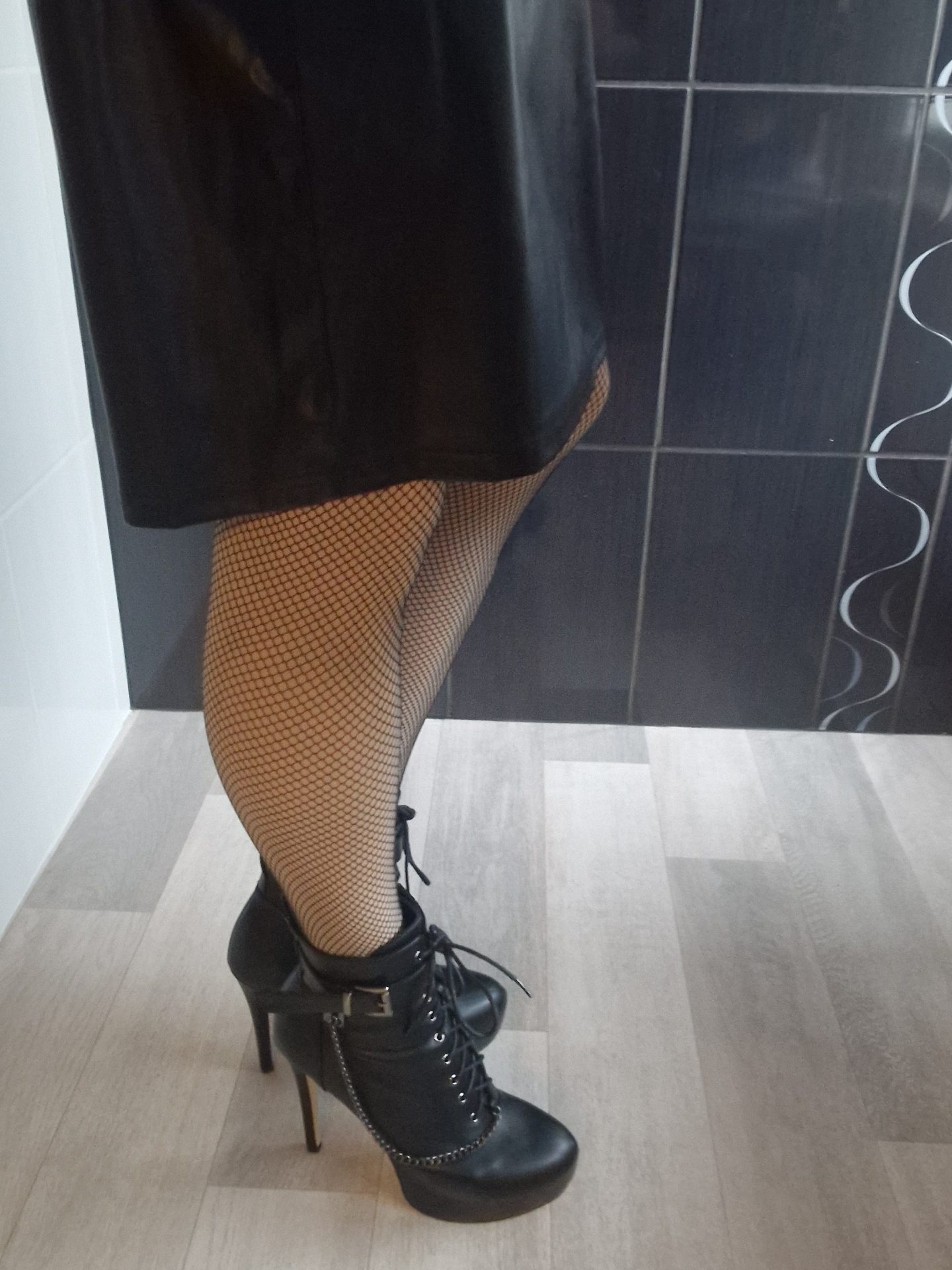 Jupe simli cuir, bas résilles et bottilons. Sexy et confortable.